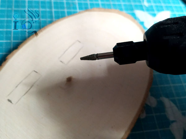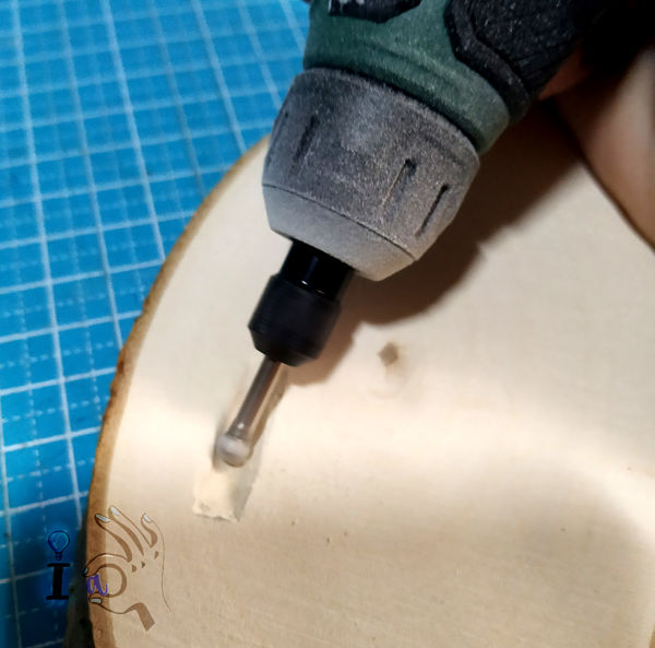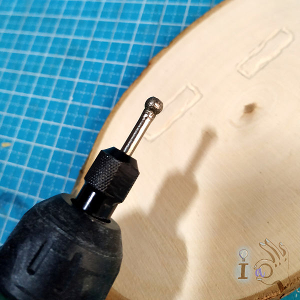 Ahora tenemos que "horadar" estas dos marcas. Para ello yo utilizo una herramienta tipo dremmell, aunque la mía no es de esta marca, con puntas de desgaste. Comienzo con una afilada para perfilar el contorno.