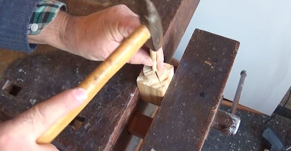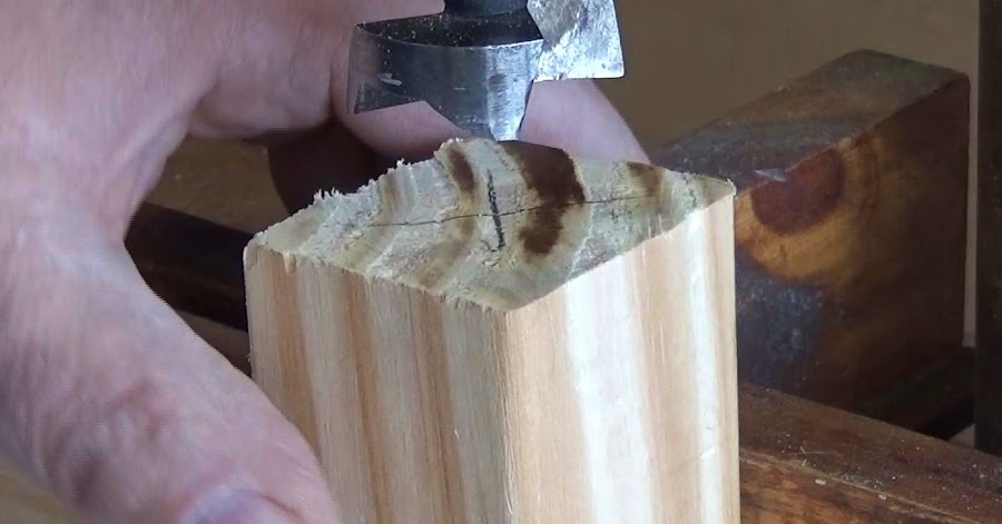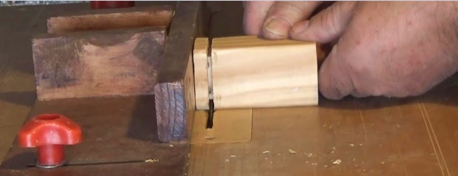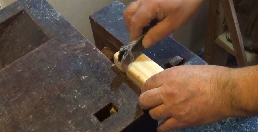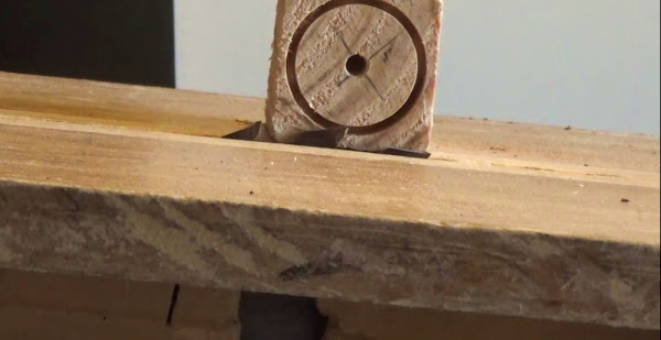 Una vez que le quitamos el excedente del contorno, hacemos dos cortes en forma de cruz sobre el cilindro de esta tapa, y colocamos un tarugo de madera de un espesor mayor al orificio central de la perforación de la guía de la mecha copa. Eso hará que es expanda el cilindro y así aumentar la presión en el cierre de la tapita, ésta cerrará bien ajustada. Luego cortamos el sobrante del tarugo, masillamos las ranuras y lijamos.