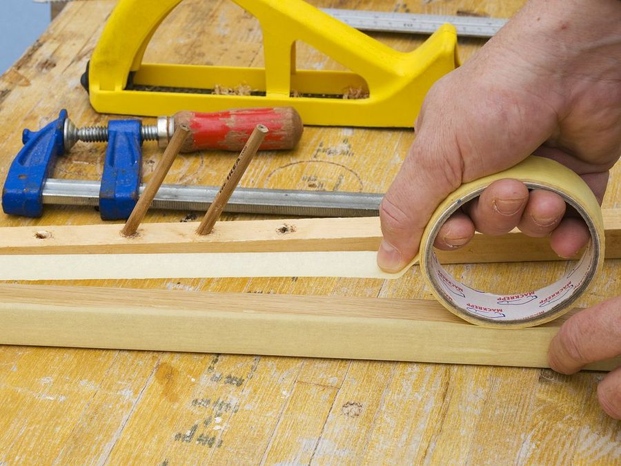 Forramos el listón con cinta de carrocero, previniendo la cola rezumante, y marcamos las cuatro líneas centrales con el azulete de los albañiles.