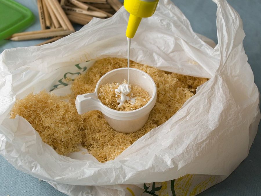 Mezclamos cola y serrín, para que los lápices, insertados de punta, queden bien encajados en los agujeros.