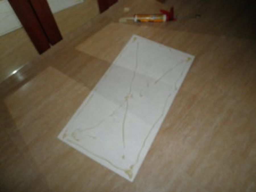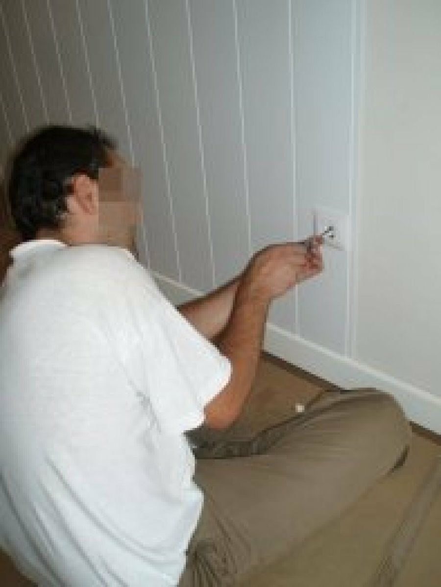 A continuación, después de realizar la marca en la pared que sirvió de guía, comenzó a poner las planchas con un adhesivo, recortando los huecos de las tomas de luz con la sierra de calar.