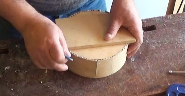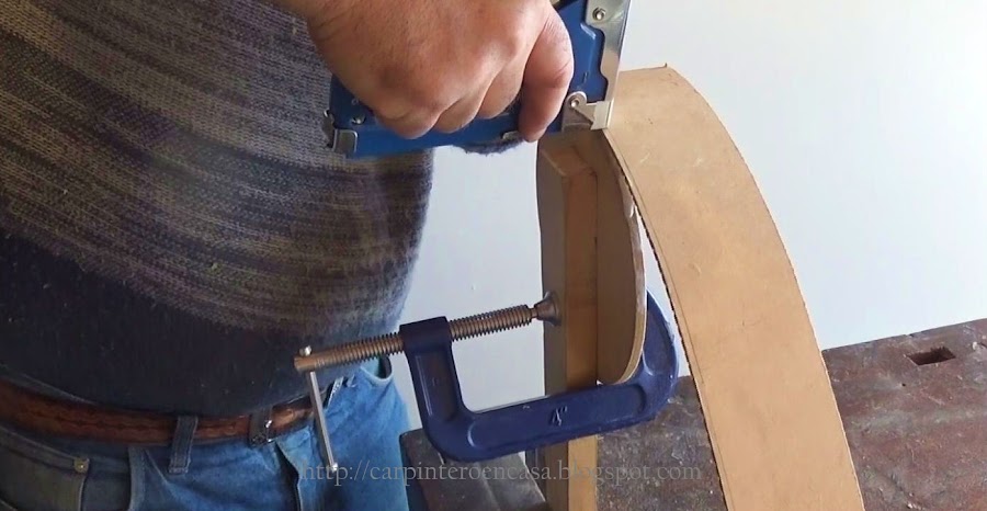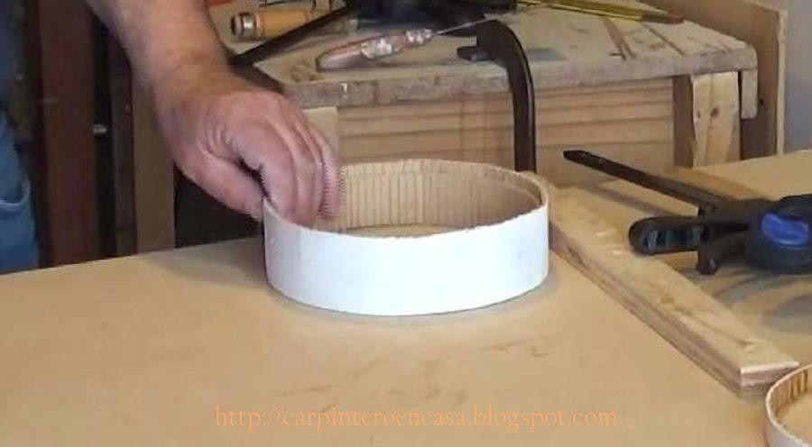 El paso siguiente será encolar los bordes de los discos, y engrampar las tiras, con grampas de 8 mm de largo. Como los discos tienen 5 mm de espesor, trazaremos una línea a 2,5 mm del borde para colocar éstas. Allí, sobre la línea será donde lo haremos. Con firmeza y con la faja bien tirante colocamos las grampas a una distancia de 2 o 3 cm una de otra.