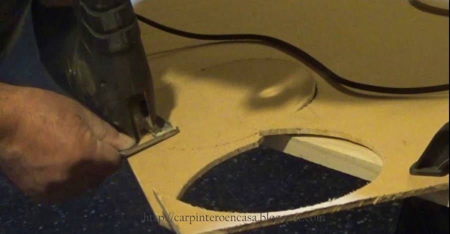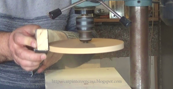 El primer paso es cortar dos discos de 18 cm de diámetro que formarán el piso y la tapa. Lo haremos con la caladora eléctrica portátil.