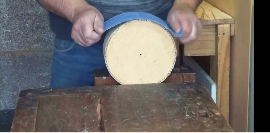 Ponemos en marcha la máquina y con una lija gruesa tipo esmeril lijamos torneando los bordes de los discos. Lo que nos dará una terminación perfecta lista para pegar a éstos las tiras ranuradas.