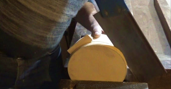 Cortamos con serrucho de costilla, y suplementamos con una tira dentro de la ranura del corte, a medida que vamos avanzando. Esto es para que no se cierre y comprima a la hoja del serrucho durante el corte.