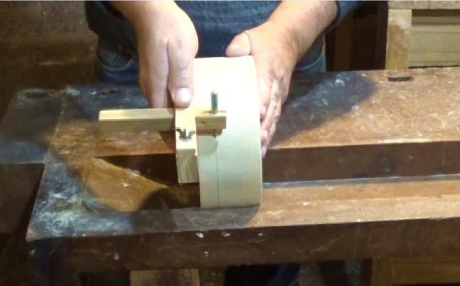 Luego de haber cortado los discos, los juntamos a ambos y agujereamos por el centro , donde hemos pinchado con el compás para trazar los círculos. Allí colocaremos un tornillo que atravesará los dos discos y luego lo colocamos en el mandril de la agujereadora de banco, si no contamos con ésta, podemos optar por una perforadora eléctrica portátil.