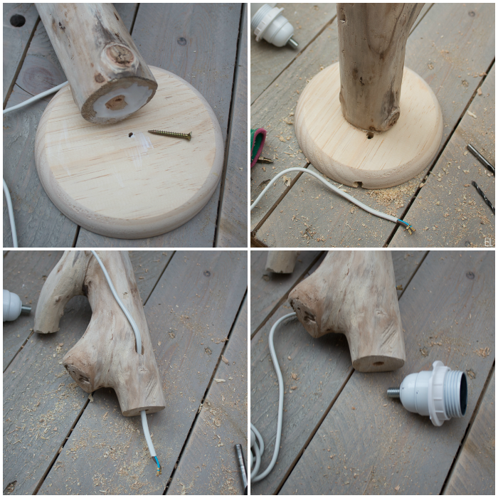 Para poder pasar el cable agujerear el tronco con el taladro en diagonal hacia arriba, hasta conectar con el agujero central.