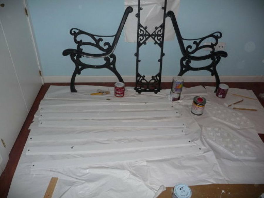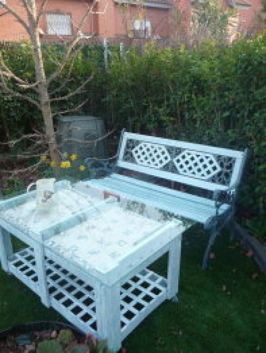 Además, nuestra amiga disponía de un banco que restauró y decoró para ir a juego con la nueva mesa. Para ello, limpió la forja y le aplicó barniz mate para metales. En cuanto a la madera, la limpió, lijó, rellenó con masilla los desperfectos, volvió a lijar, aplicó anticarcoma e imprimación, y después la decoró de la misma forma que la mesa: esmalte azul, esmalte blanco y patina.