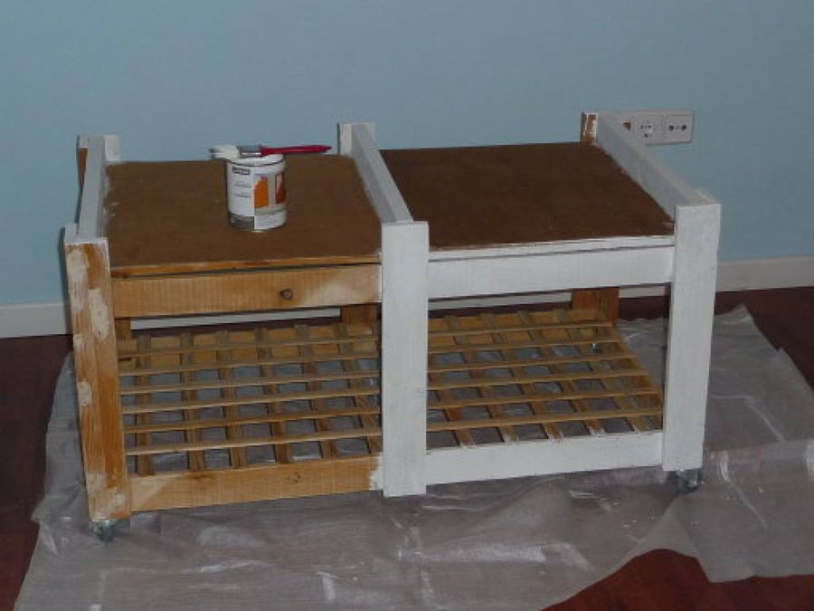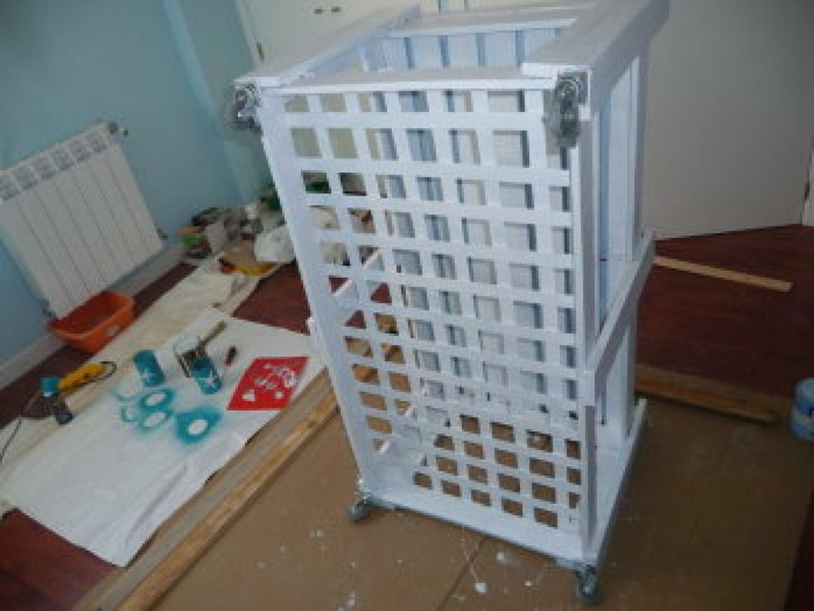1 La primera decisión que tomó Nlle fue añadirle ruedas a la estructura, elección muy práctica, ya que así podía manejarla mucho mejor y trabajar con mayor facilidad.2 En segundo lugar se retiraron todos los clavos que sobresalían y “todo lo que podía pinchar”, así como las maderas transversales de los laterales. Después, se reforzó la estructura con escuadras y refuerzos metálicos por debajo.