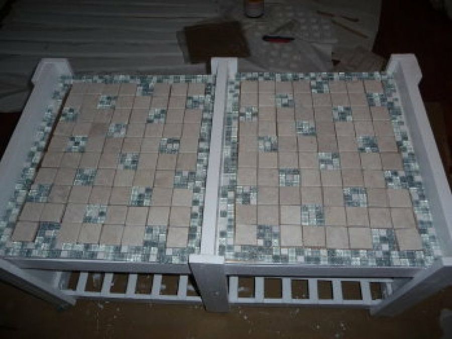 6 Una vez seca la pintura, era el momento de decorar la parte superior, para lo que empleó gresite de cristal y de piedra. Después de idear varios diseños, finalmente se decantó por esta combinación. Así, clavó sobre la base dos piezas de cartón piedra, rellenando los huecos con masilla. Así, como el alto de los dos gresites era diferente, tuvo que emplear silicona para las de piedra y porcelánico blanco para las de cristal.
