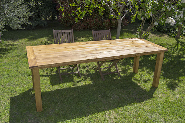 Bueno, y después de este largo post...tachán... Mi gran mesa de exterior de madera DIY terminada, ¡por unos 80 euros!