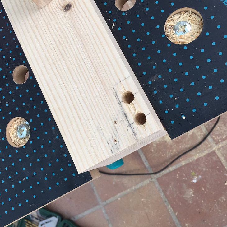 - hacer dos agujeros con el taladro del diámetro de la espiga ( 10mm) en la pata y también en el extremo del listón de 5cm de forma que nos queden exactamente enfrentados. Para ello hay que medir muy exactamente en la madera, ya que si no no encajarán.
