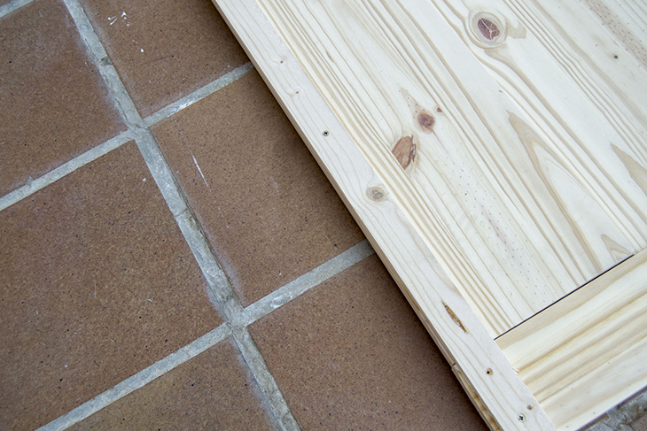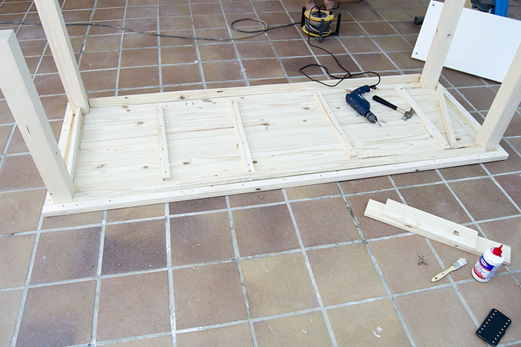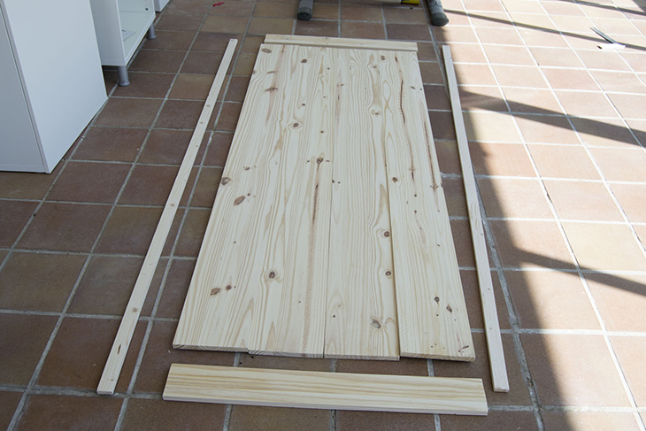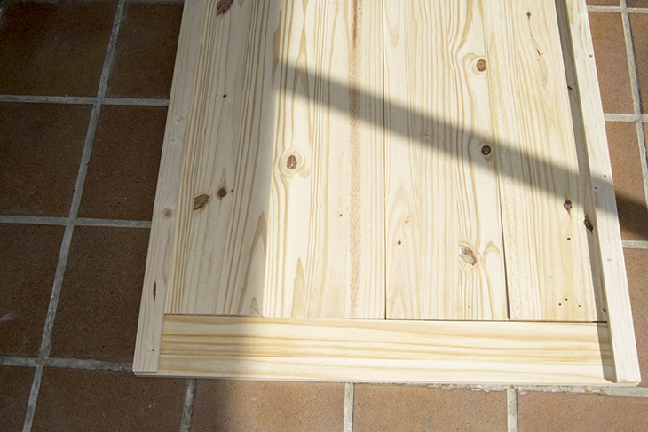 Lo colocamos todo junto en el suelo del revés y lo unimos mediante varios listones con tornillos y cola.