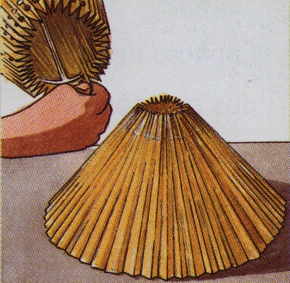 En cada pliegue debe haber dos agujeros, el de arriba, a 2,5 cm. del borde superior, para el cordón de fruncir y el de abajo, a 2 cm. de distancia del primero, para el armazón metálico. A continuación, con unas tijeras haga cortes a lo largo de la fila inferior de agujeros y por su cara interior para encajar el aro.