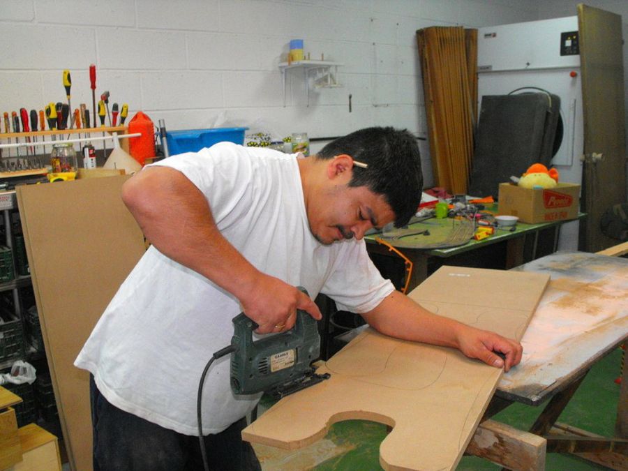 Nuestro amigo Juanma1 escoge un tablero DM con las dimensiones apropiadas, y, después de dibujar las piezas que formarán la sillita infantil, comienza a recortarlas con la sierra caladora, herramienta especialmente idónea para efectuar cortes curvos.