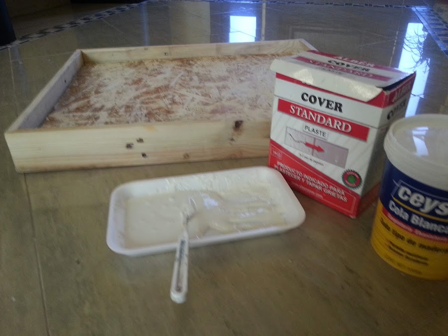 De fondo el cuadro donde irán pegadas las piezas, pero como el marco de palet tiene agujeros y no es madera muy bonita, opto por hacer un emplaste texturizado usando emplaste de paredes, mezclado con cola de carpintero.