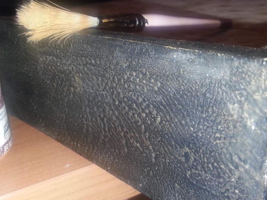 Foto detalle de como queda el relieve del emplaste una vez terminado. Primeramente le doy con acrílico negro (Una vez seca el emplaste), y seguidamente con acrílico bronce y pincel seco resalto las irregularidades del emplaste.