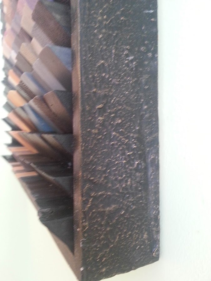 Para el corte de las piezas fui alternando cortes rectos con cortes de 45 º . Todas las piezas tienen la misma medida, 5 cm de la base a la parte mas alta. Aunque alguna pieza la quise hacer un poco mas larga, para destacar un poco en el cuadro.