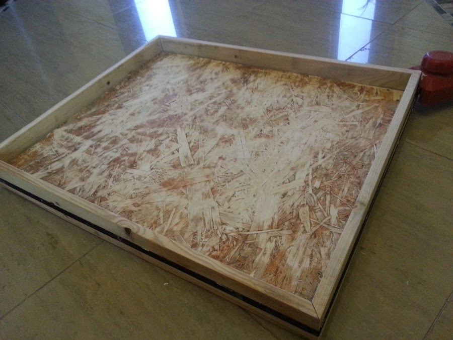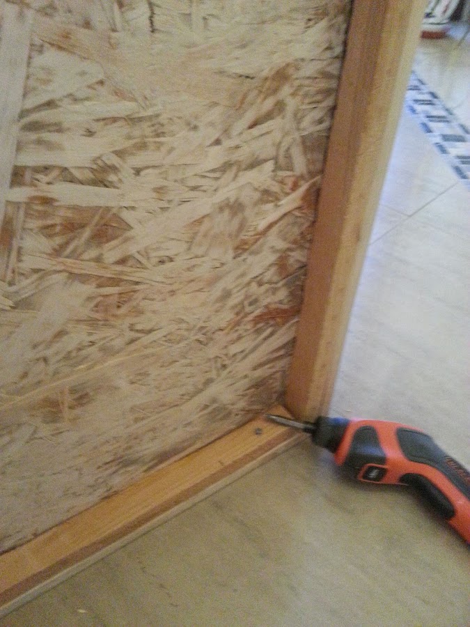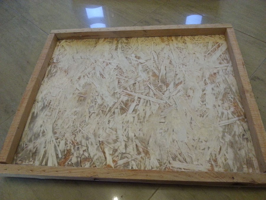 Y en esta foto se puede ver la parte trasera de nuestro cuadro, y se ve como atornillo los listones de la base de aglomerado, al marco de palet. (no se si se me entiende, si logro explicarme).