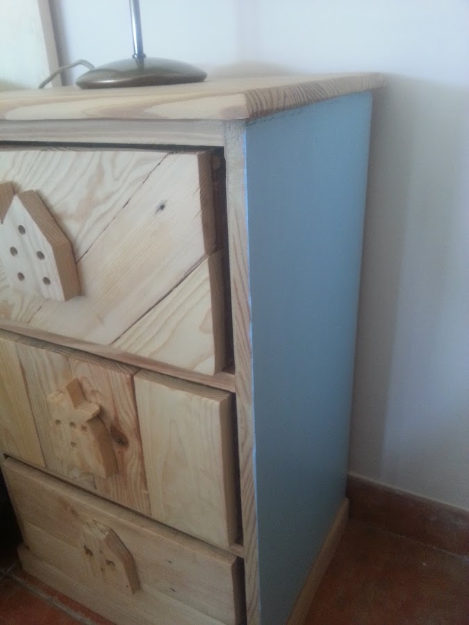 Reciclando madera de palet, se fueron haciendo las composiciones de los cajones, tal y como se ven en la foto, y a modo de tiradores se quitaron los que tenía originales y los hicimos más originales aun. Cortando la madera de palet y haciendo figuras de casas.