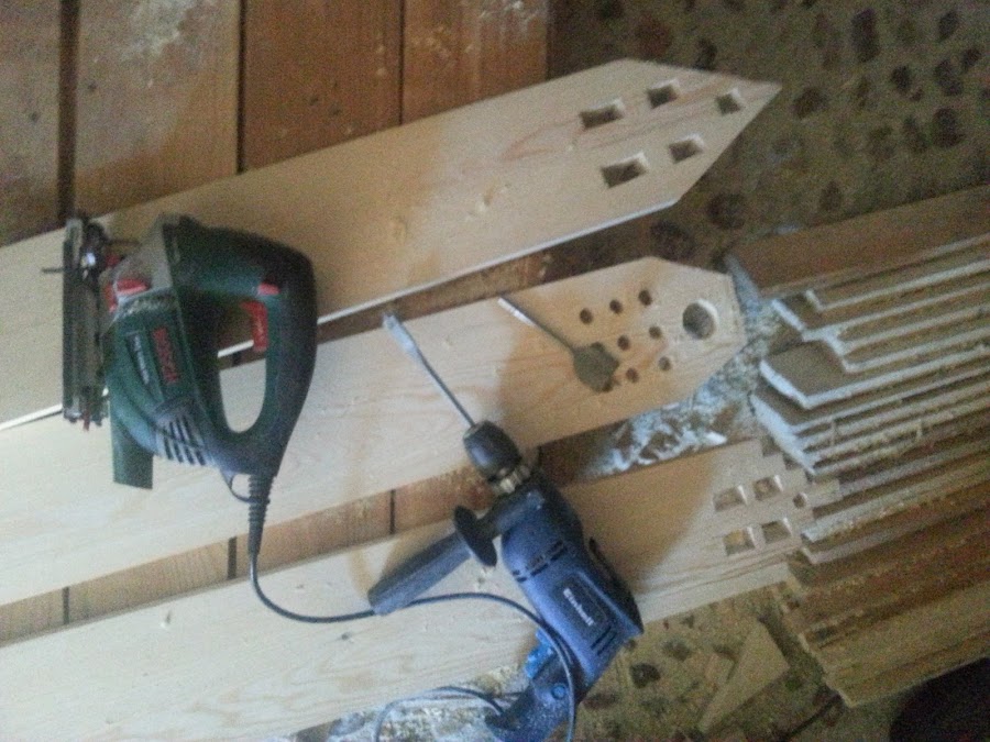 Ayudándonos con el taladro y brocas de pala de distintos grosores y con la sierra de calar con la hoja para cortes curvos, fuimos perforando la madera.