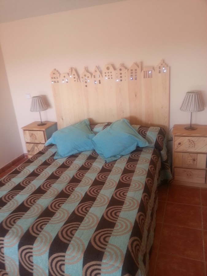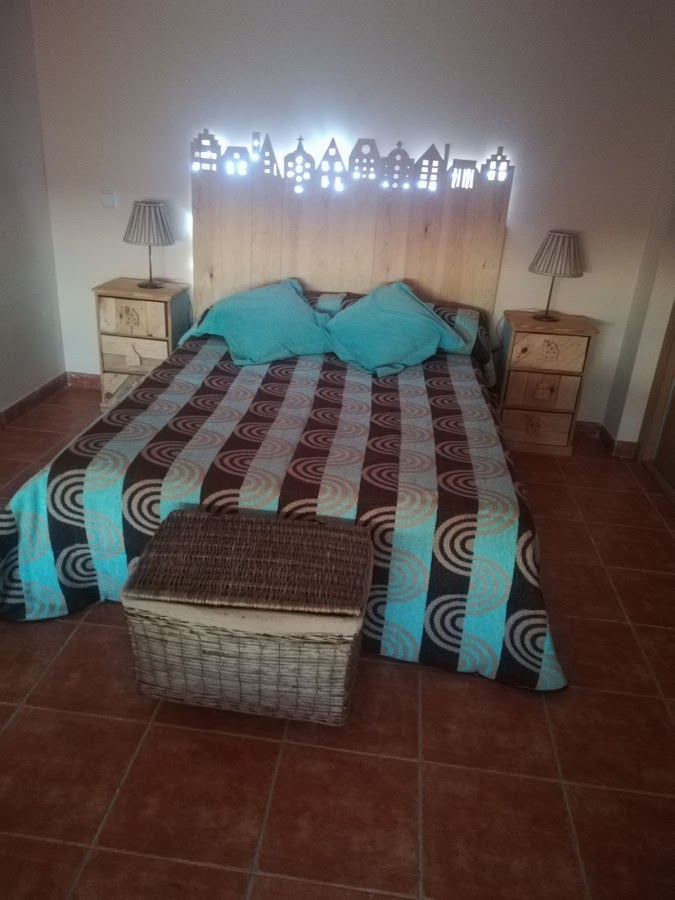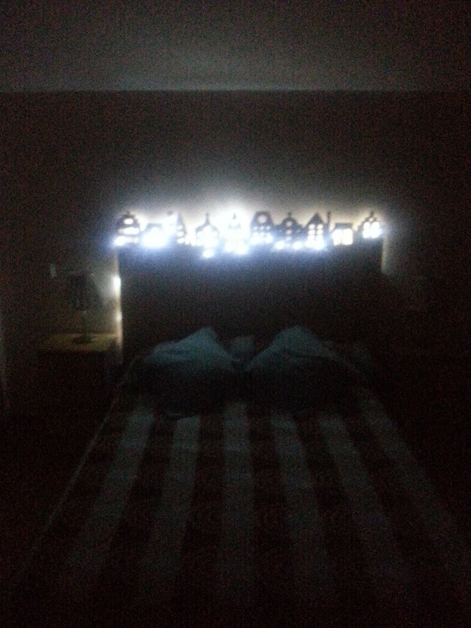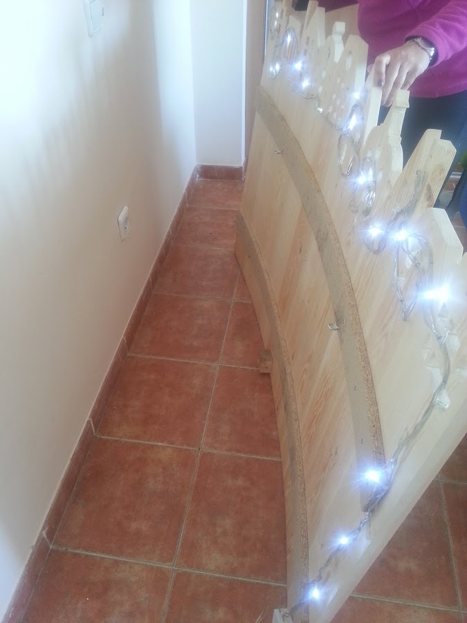 Pasaron varios días el cabecero colgado en la pared hasta que fuimos a poner las luces, cuando por sorpresa comprobamos que el cabecero se había arqueado. Pero fue algo que ocurrió por que si pero nos gustó pues se quedaba mas pegado a los laterales, favoreciendo que la luz solo saliera por los agujeros de lo que simulan ser las ventanas de las casas. Además el cabecero ya no se movería más pues la cama no le dejaría avanzar en su arqueo.