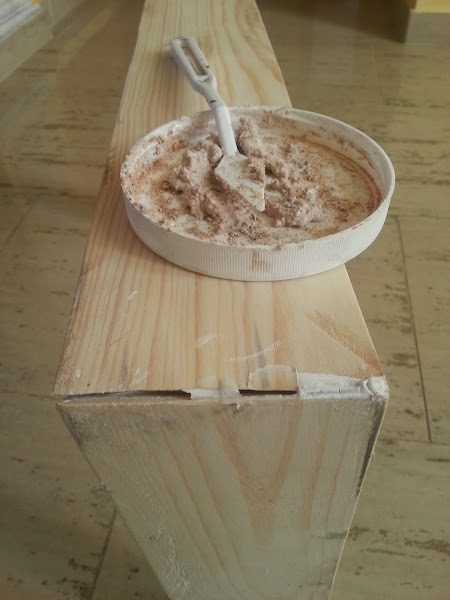Como ya os digo no soy ninguna experta y los ingletes nunca me quedan perfectos, como en este caso de la foto,por lo que preparo una masilla a base de serrín tamizado y cola de carpintero.
