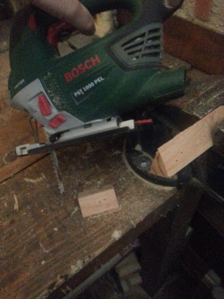 Con la sierra de calar, corto unas esquinas de madera, procedentes de las cajas de fruta, para reforzar las escuadras de nuestro cuadro expositor.