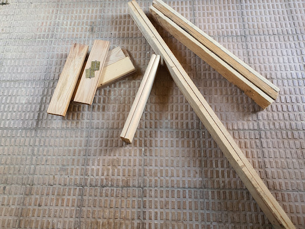 En mi taller tengo muchas maderas desmontadas de palet, o de retales que una vez me dio una carpintería que cerraba por jubilación. Las tengo ordenadas por tamaños y medidas iguales y las ato con cuerdas formando paquetes, y así al estar almacenadas no se deformen.