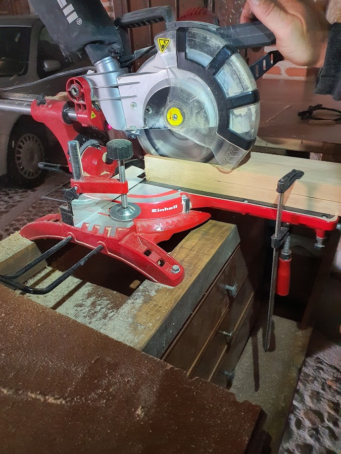 Con la sierra ingletadora también corto el ancho poniendo el corte primero por un lado y luego por el otro al ser telecopica la ingletadora, me da un poco mas de juego. Tengo que decir que este corte se haría genial si tuviera la sierra circular de mesa, pero me apaño con lo que tengo.