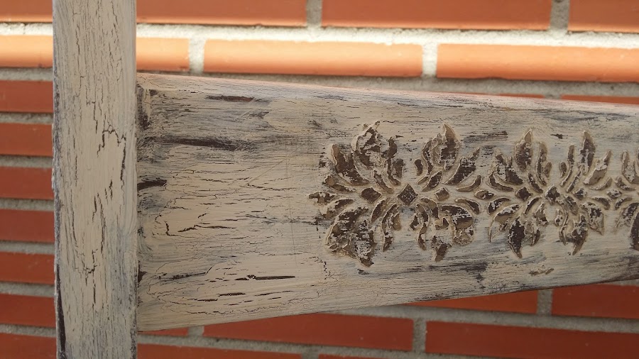 En esta foto se puede apreciar mas a detalle como cuartea la pintura blanca sobre el craquelador, dejando entre ver el marrón de base, y como el stensil al ser lijado crea el efecto desgastado que por lo menos a mi tanto me gusta.