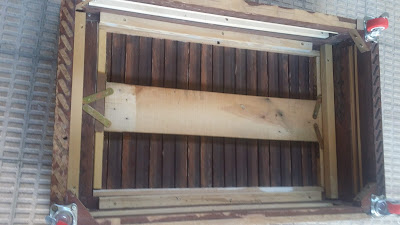 En esta foto podemos ver como el frente de la parte baja del sofa le pongo la pieza que hago peroooo..... como no tiene el largo suficiente de otro trozo de ventana hago otra pieza que ensamblo mediante tubillones pegados con cola de carpintero.