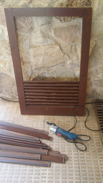 Empezamos haciendo la mesa, para ello en la foto se ve como con la hoja de cortar madera colocada en mi multiherramienta, fui cortando a ras de un lateral las lamas de la celosía, cuando tenía cortado un lateral la lama de celosía se desencajaba del otro lado y así quité todas las lamas. Quedando el armazón de la ventana.