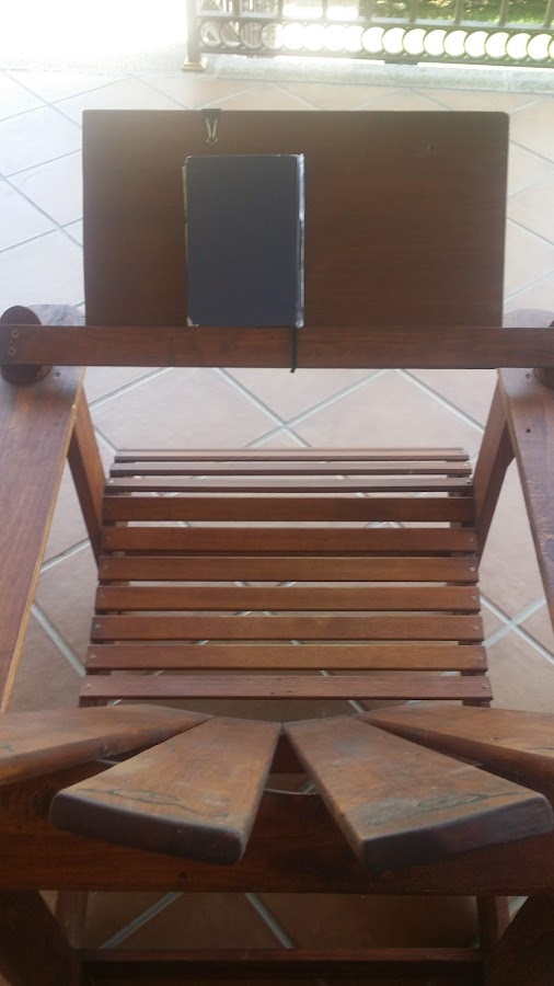 El pupitre que se ve en la foto es invento y diseño de mi marido. El debido a la desgracia de un accidente de moto su brazo izquierdo quedó invalido, es por eso que cuando se sienta en su silla adirondack le surgía la necesidad de tener donde apoyar su libro o su tablet.