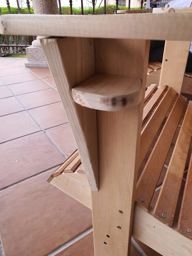 Y encaja justo en los agujeros, quedando fijada. Mi hijo también durante el confinamiento le encantaba salir a la terraza con su apuntes y estudiar sobre este escritorio.