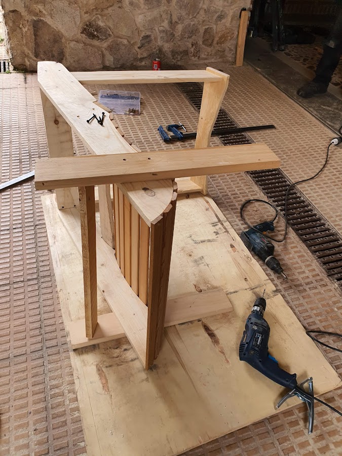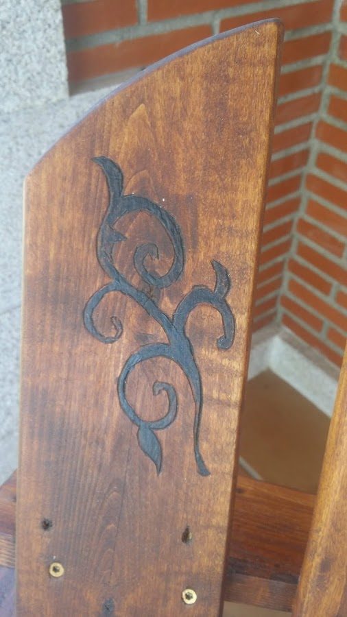 Esta es la silla ya terminada se ve que las maderas son usadas, y de distintas clases.