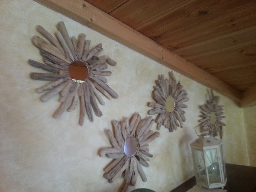 Detalle de la foto donde se ve como luego pongo otra fila de palítos sobre los grandes para dar mas vistosidad al espejo.