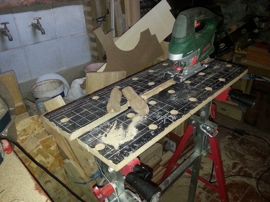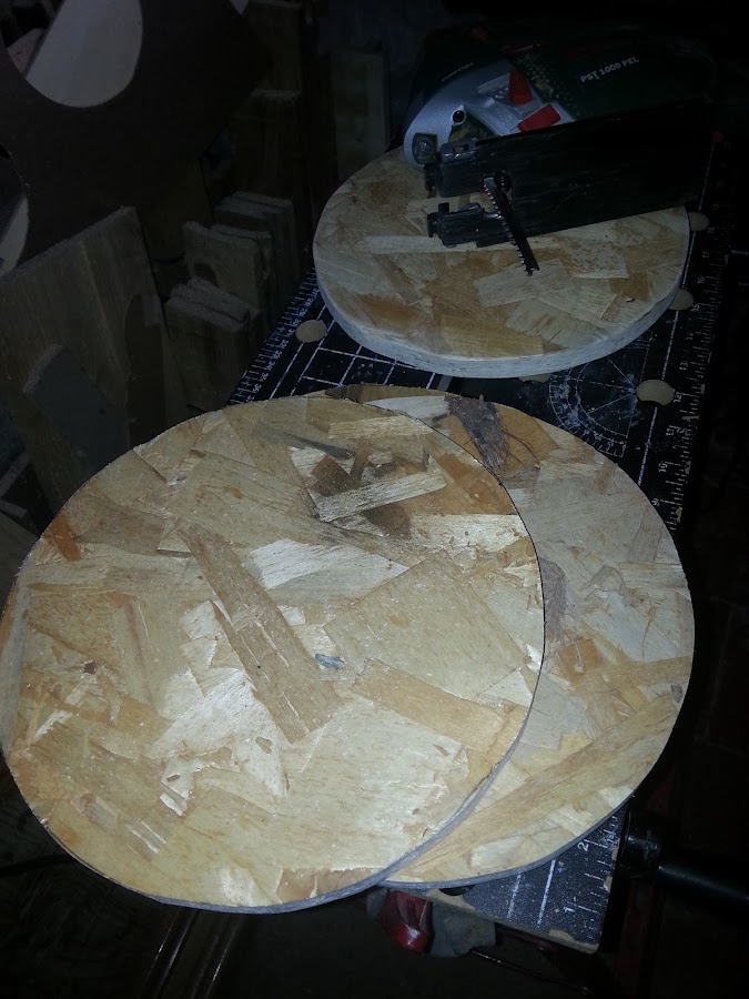 Comienzo cortando la madera que tenía procedentes de un contenedor de obra, este tablero se llama Osb o de fibras orientadas, tiene unas excelentes cualidades. Trazo los círculos y procedo a su corte y posterior lijado.