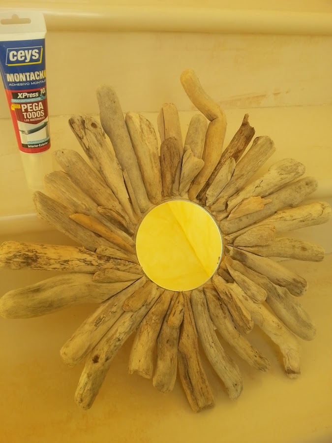 Comienzo a pegar, previamente marco el circulo donde irá el espejo, y así me sirve de referencia.
