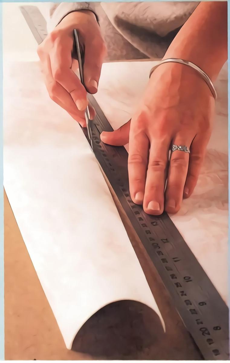 Desenrolle el papel sobre mesa y mida el largo que necesita, añadiendo 5 cm. en cada extremo para los salientes. Con la escuadra y la regla, marque la línea de corte.