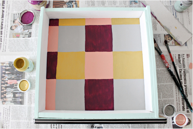 Como iba a utilizar diferentes colores, tuve que ir tapando los huecos que irían en otro color. De ahí la laboriosidad de este DIY, porque estaba todo el tiempo cambiando de sitio la cinta, tapando lo que no quería pintar y entre medias esperando a que secase la pintura: