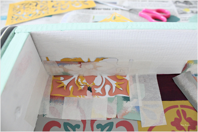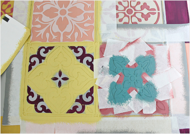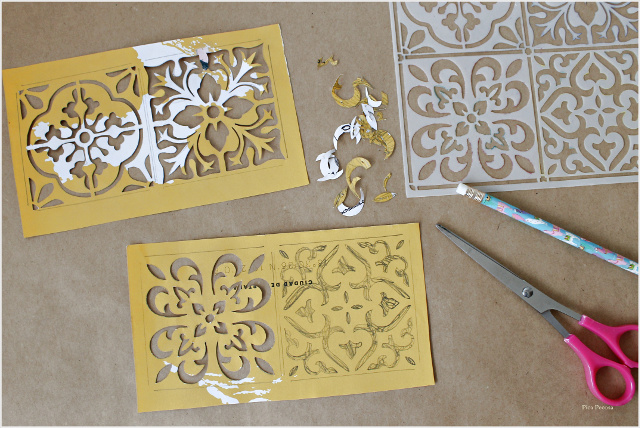 La plantilla que he utilizado es el modelo Mosaique. Al estar hecha de metacrilato facilita que se adhiera a la superficie y además la hace muy resistente a la hora de pegar y despegar la cinta de carrocero y de lavarla bajo el grifo.