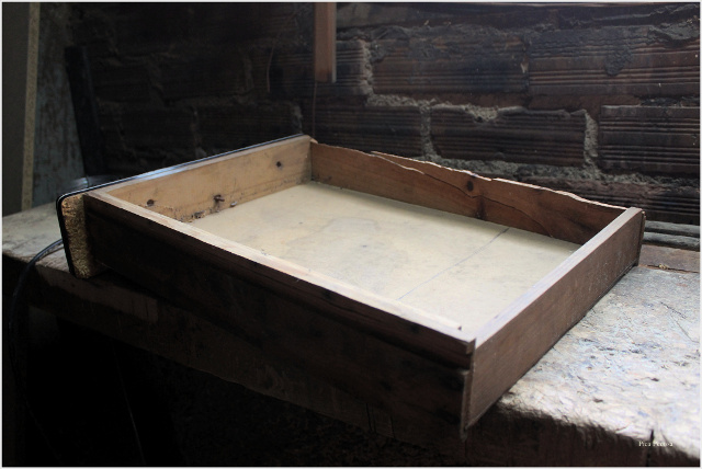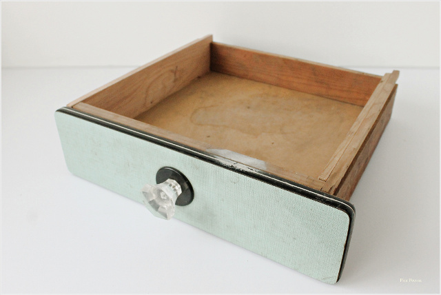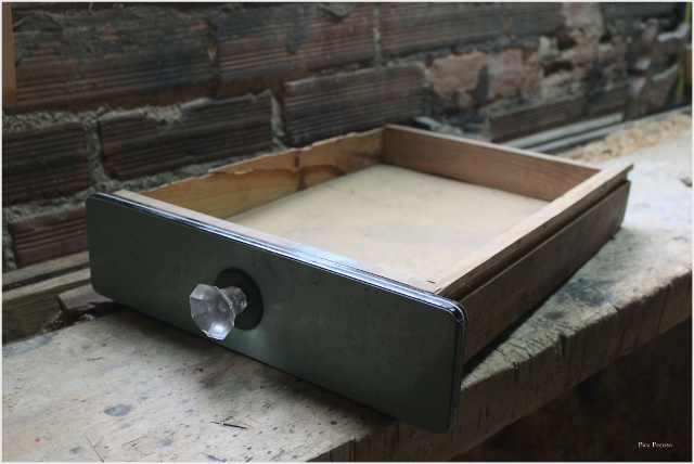 Pero empecemos por el principio. Este cajón lo encontré al borde de la carretera un día de lluvia. Estaba esperándome, porque a la ida no había nada y cuando pasé de vuelta allí lo tenía junto a un contenedor de basura. Lo recogí única y exclusivamente porque el color de la fórmica y el tirador me recordaban la alacena que había en casa de mi abuela. Si no llega a ser por eso paso de largo, porque tenía un lateral roto y se le veía muy traqueteado:
