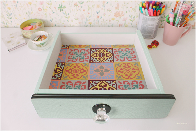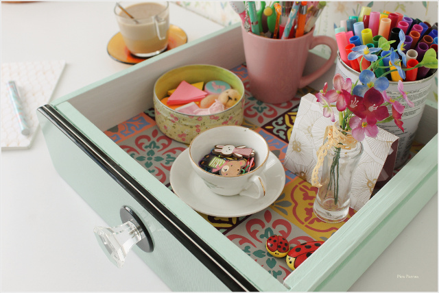Por fin hemos acabado con la habitación de invitados-trastero-vertedero y ya tenemos un pequeño despacho. Todavía no se si podré poner el estante-casita (aquí) porque me temo que tengo más cosas que espacio, pero no pierdo la esperanza. Voy haciendo pequeños avances, como este cajón que en su día estaría en una cocina guardando quién sabe qué y ahora está atiborrado con material de oficina (no te dejes engañar por las fotos, si lo saco con todo ni siquiera se intuiría el fondo azulejado).
