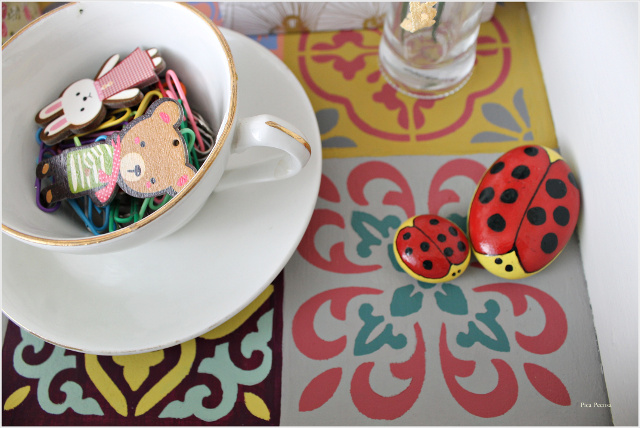 De ellas me gustaron sobre todo los colores, especialmente los tonos pastel de la chalk paint. Sorpresa muy agradable porque cubre bien, tanto que sólo habría necesitado una mano (aunque yo por si acaso le dí dos porque después de quitar la plantilla ya no podría repasarlo). Curiosamente una que no cubrió bien (y eso que le di varias manos) fue Velvet. Digo curiosamente porque al ser oscura pensé que iba a quedar mejor, pero al final todavía se le notaban los brochazos. Y me pasó a la inversa con Lemon, que al ser tan clarita e ir sobre la Velvet creí que no cubriría y se notarían los brochazos, y todo lo contrario.