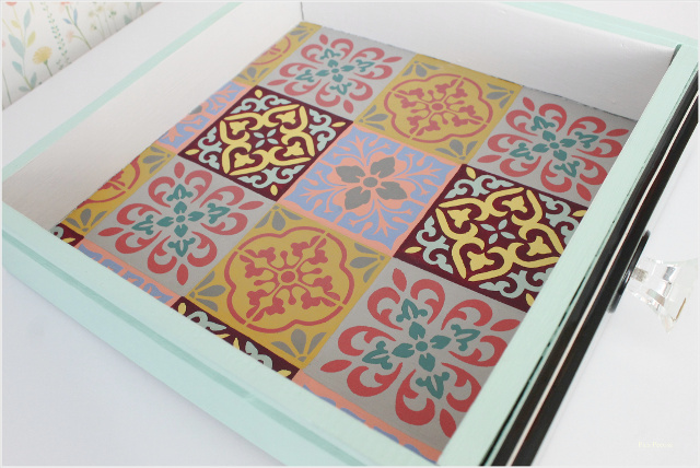 En un principio había marcado los bordes de los cuadros que vienen en la plantilla, pero quedaban fatal por lo que te decía de que en el cajón no hay una línea recta, así que acabé tapándolos para que no se notase tanto.