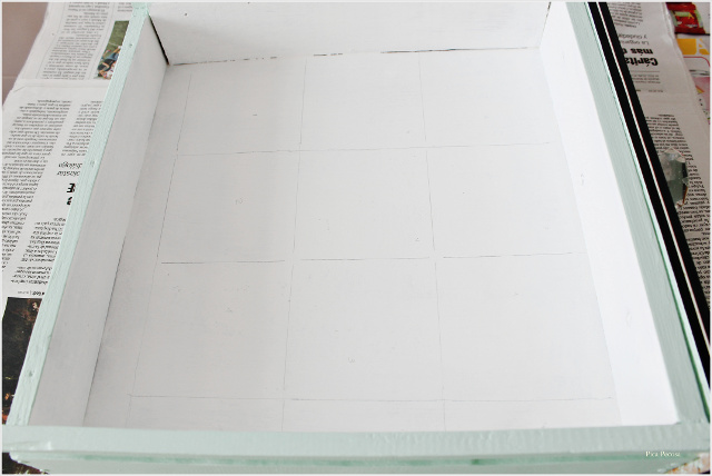 A continuación pinté el exterior de color Mint porque es casi exactamente el mismo tono que la fórmica y así lo uniformaba. El contraste estaría en el interior, donde empecé dibujando los cuadrados de los azulejos para centrar la plantilla:
