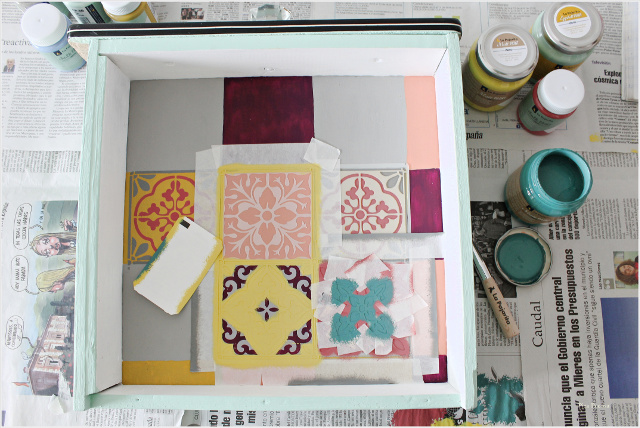 Una vez lo tuve en condiciones para trabajar sobre él y después de limpiarlo bien con amoníaco, quedaba la parte divertida: pintar. Había recibido unas pinturas y unas plantillas de La Pajarita, así que me puse manos a la obra para ver de qué eran capaces.
