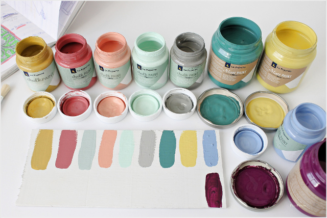 Utilicé tres gamas diferentes. De Chalk Paint usé Dijon, Fresa Boho, Peach, Mint, Gris Kioto y Azul Horizonte. De Matt Paint, Lemon, Velvet y Jade. Y de Eggshell Paint, Cancún y Magnolia.