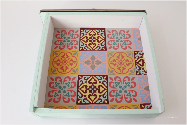 Las bases son Velvet, Dijon, Peach y Gris Kioto. El cajón está hecho de aquella manera, lo que sumado a los años, la humedad y el repuesto que le puso mi padre hace que no haya una sola línea recta. Aquí no tanto, pero con los dibujos se nota claramente que no hay ningún azulejo que encaje con el compañero:
